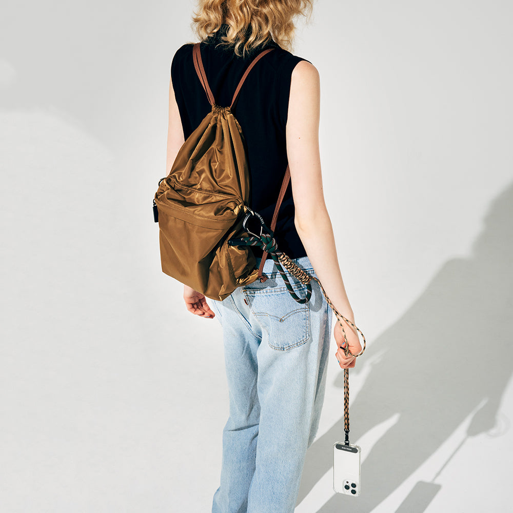 両サイドには携帯⽤ストラップやチャームなどを取り付けられるDカンも装備。